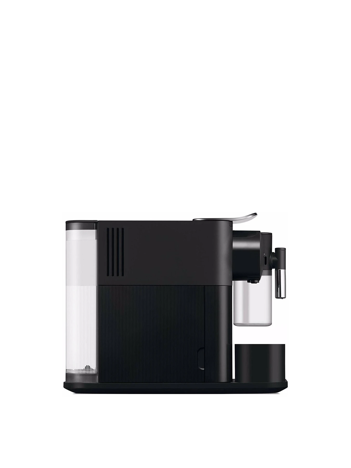 - Composition and Material: Features – Removable water tank: 1 Litre. Removable fresh milk container: 0.17 Litre. Used capsule container capacity: 8. Descaling alarm. Folding drip tray for Latte Macchiato glass. Automatic power off after 2 mins. One-touch recipe preparations (milk-based).
